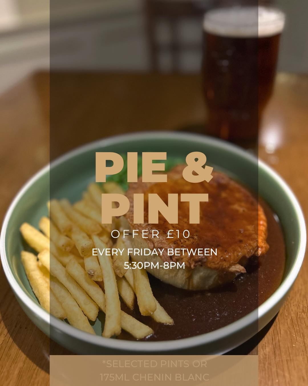 Enjoy a hearty homemade pie, chips & a pint (or 175ml Chenin Blanc) for just £10!